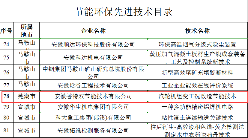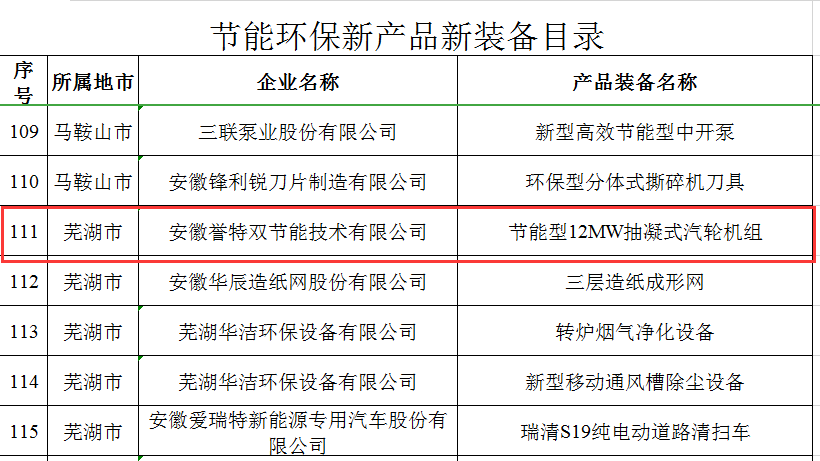 我公司“安徽譽特雙節(jié)能技術(shù)有限公司”入選“節(jié)能環(huán)保服務(wù)機構(gòu)目錄、核心產(chǎn)品“節(jié)能型12MW抽凝式汽輪機組”入選節(jié)能環(huán)保新產(chǎn)品新裝備目錄、核心技術(shù)“汽輪機組變工況改造節(jié)能技術(shù)”入選節(jié)能環(huán)保先進技術(shù)目錄,此次入選,為公司連續(xù)四年入選。
