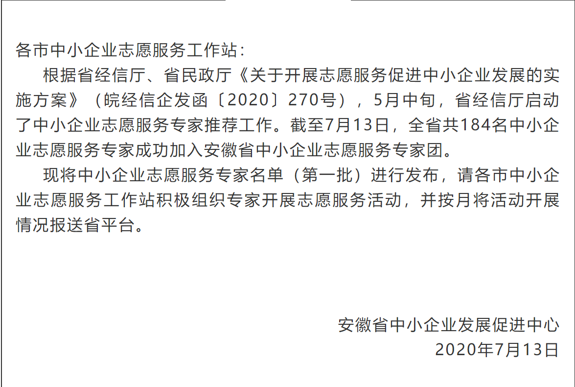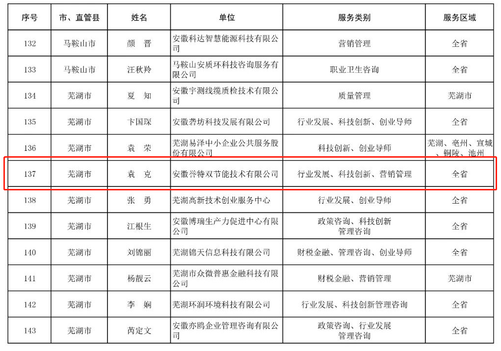 7月13日,安徽省中小企業(yè)志愿服務專家名單第一批,經省經信廳、省民政廳審核、認定,并正式予以公布。我公司總經理袁克同志榮登榜單,喜獲認定,同時也是蕪湖市唯一的節(jié)能環(huán)保產業(yè)入選單位。