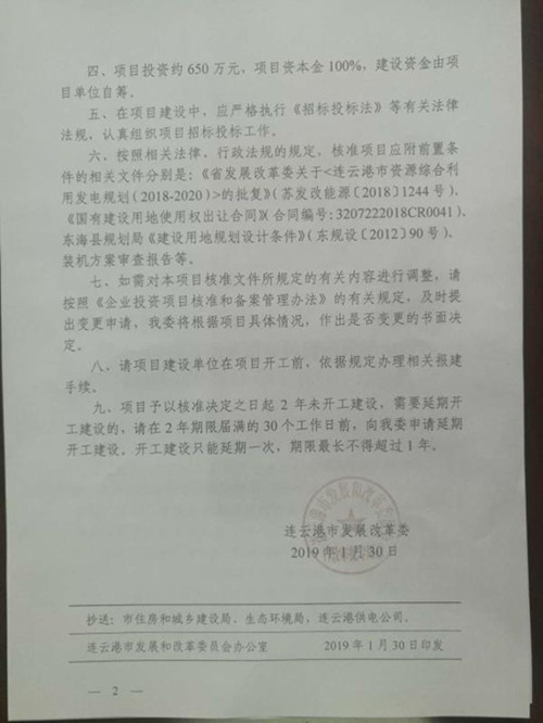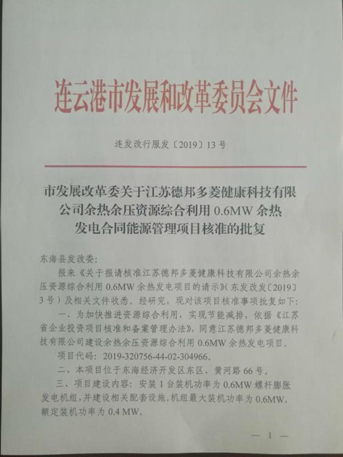 該項目當(dāng)前進展順利,經(jīng)大力推動,已順利獲取《江蘇省發(fā)展改革委關(guān)于<連云港市資源綜合利用發(fā)電規(guī)劃(2018-2020)>的批復(fù)》(蘇發(fā)改能源〔2018〕1244號)、《連云港市發(fā)展改革委關(guān)于江蘇德邦多菱健康科技有限公司余熱余壓資源綜合利用0.6MW余熱發(fā)電合同能源管理項目核準(zhǔn)的批復(fù)》(連發(fā)改行服發(fā)〔2019〕13號)、《東海縣發(fā)改委關(guān)于報請核準(zhǔn)江蘇德邦多菱健康科技有限公司余熱余壓資源綜合利用0.6MW余熱發(fā)電項目的請示》(東發(fā)改發(fā)〔2019〕3號)、《裝機方案審查報告》等文件和項目核準(zhǔn)批文。