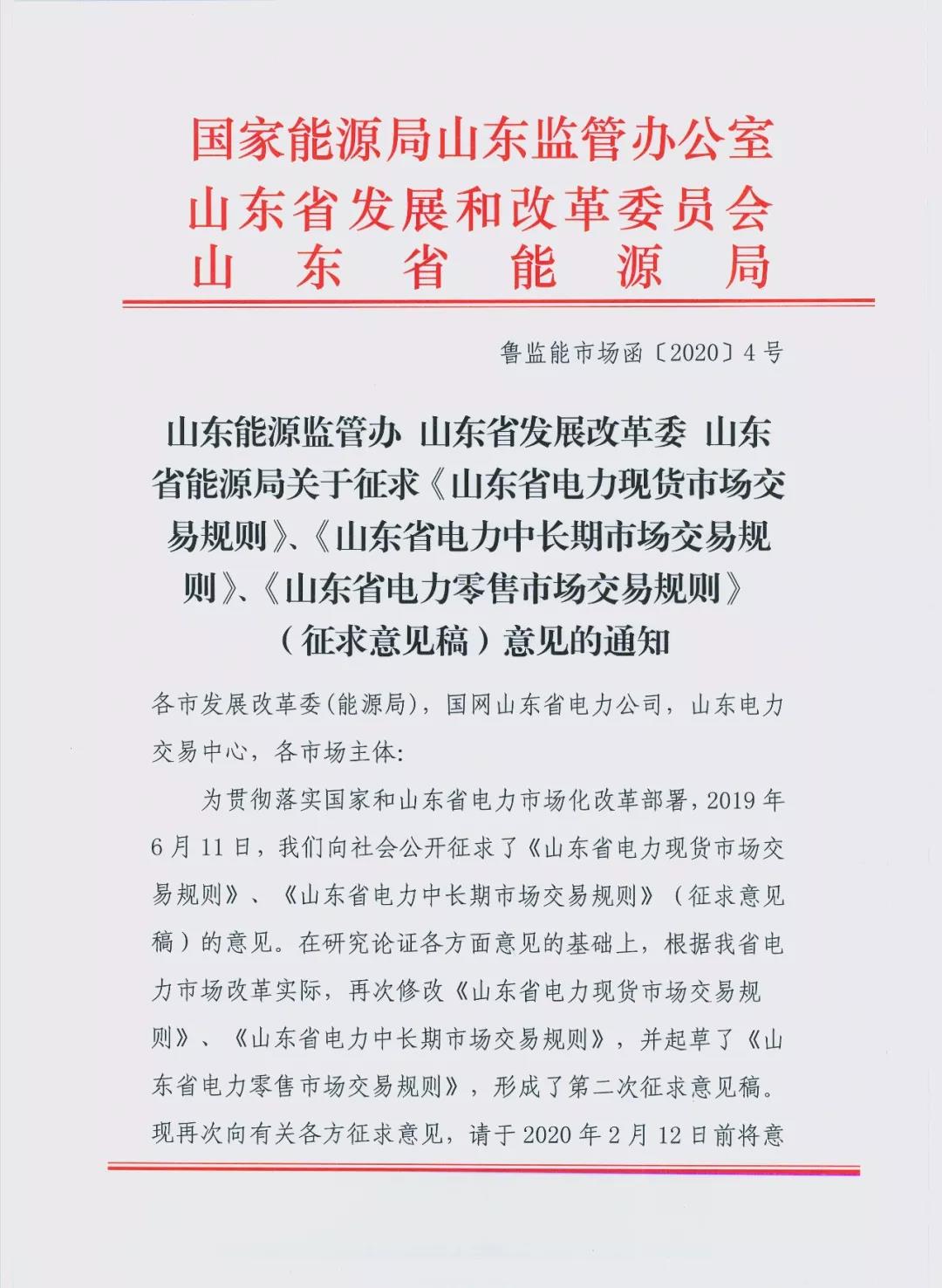 北極星售電網(wǎng)訊:北極星售電網(wǎng)獲悉,國家能源局山東能監(jiān)辦、山東省發(fā)改委、山東省能源局日前發(fā)布了關(guān)于征求《山東省電力現(xiàn)貨市場交易規(guī)則》、《山東省電力中長期市場交易規(guī)則》、《山東省電力零售市場交易規(guī)則》(征求意見稿)意見的通知。山東為貫徹落實(shí)國家和山東電力市場化改革部署,2019年6月11日,山東省向社會公開征求了《山東省電力現(xiàn)貨市場交易規(guī)則》、《山東省電力中長期市場交易規(guī)則》(征求意見稿)的意見。在研究論證各方面意見的基礎(chǔ)上,根據(jù)山東省電力市場改革實(shí)際,再次修改《山東省電力現(xiàn)貨市場交易規(guī)則》、《山東省電力中長期市場交易規(guī)則》,并起草了《山東省電力零售市場交易規(guī)則》,形成了第二次征求意見稿?,F(xiàn)再次向有關(guān)各方征求意見,并請求社會各界于2020年2月12日前將意見反饋。