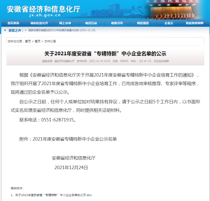 近日,按照安徽省“專精特新”相關(guān)政策要求,安徽省經(jīng)濟(jì)和信息化廳組織開(kāi)展了2021年度安徽省專精特新中小企業(yè)培育工作征集及評(píng)審工作,我公司成功入選。