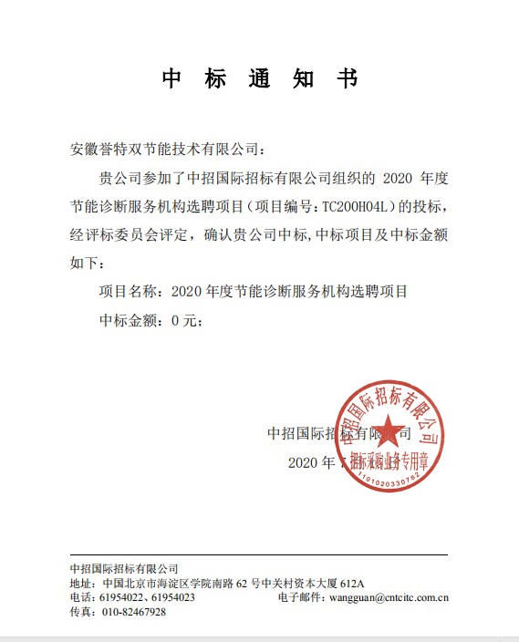 2020年工業(yè)節(jié)能診斷服務(wù)中標通知書