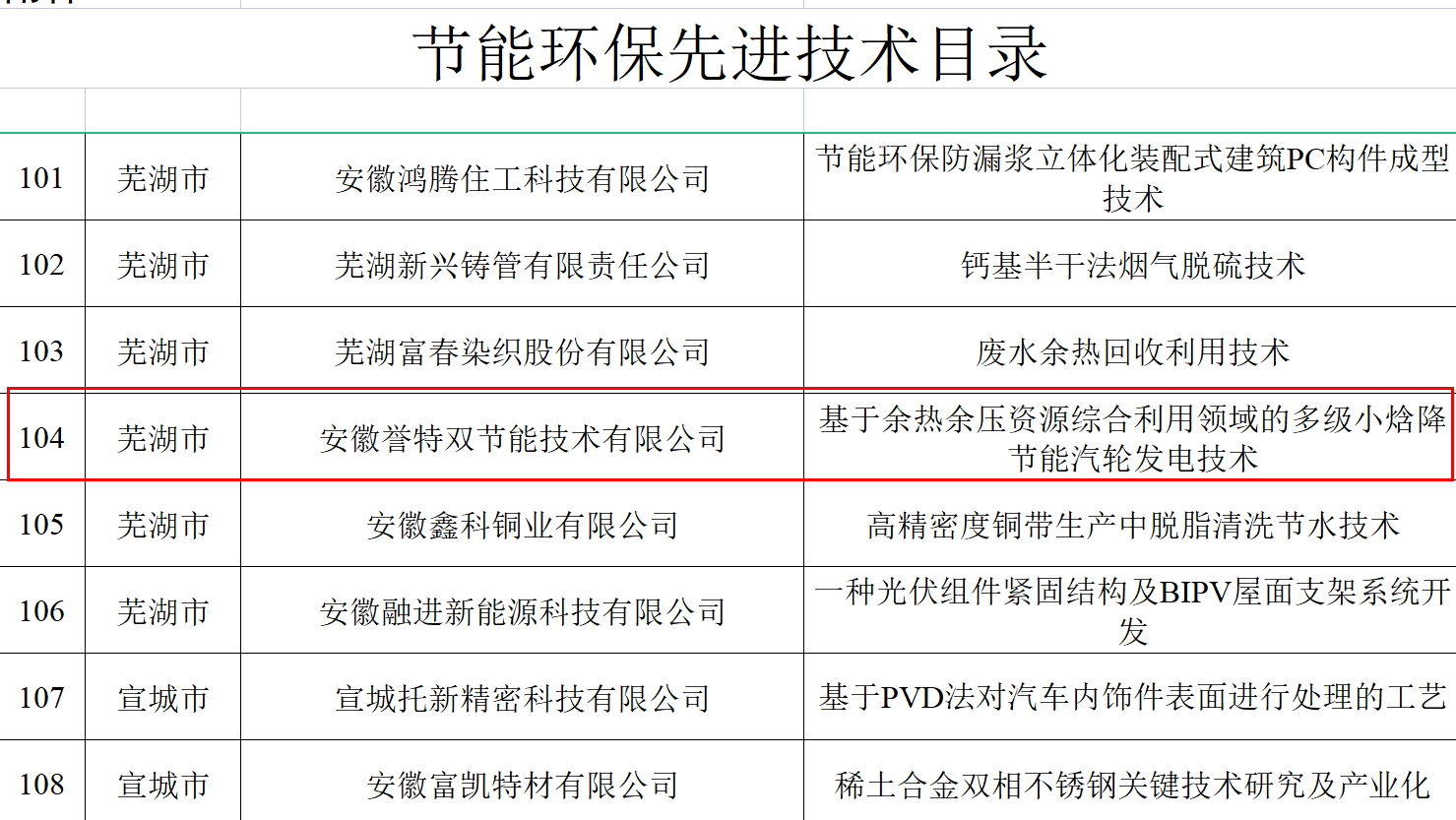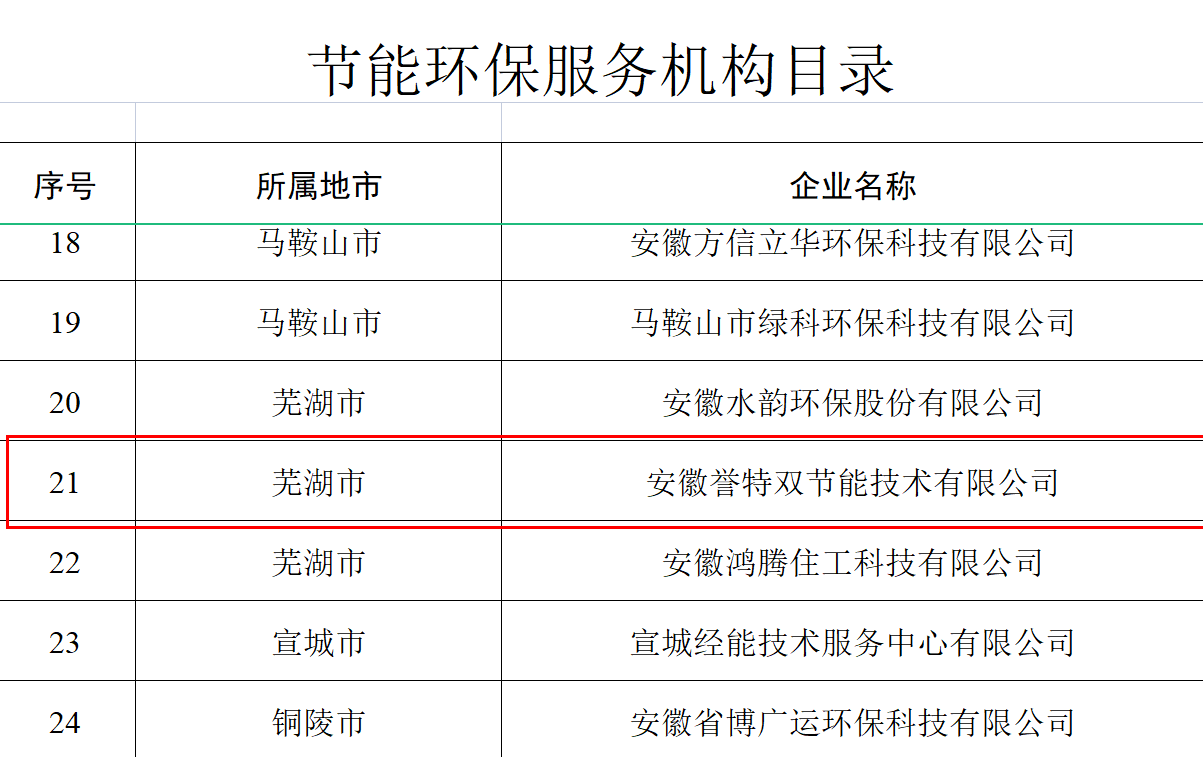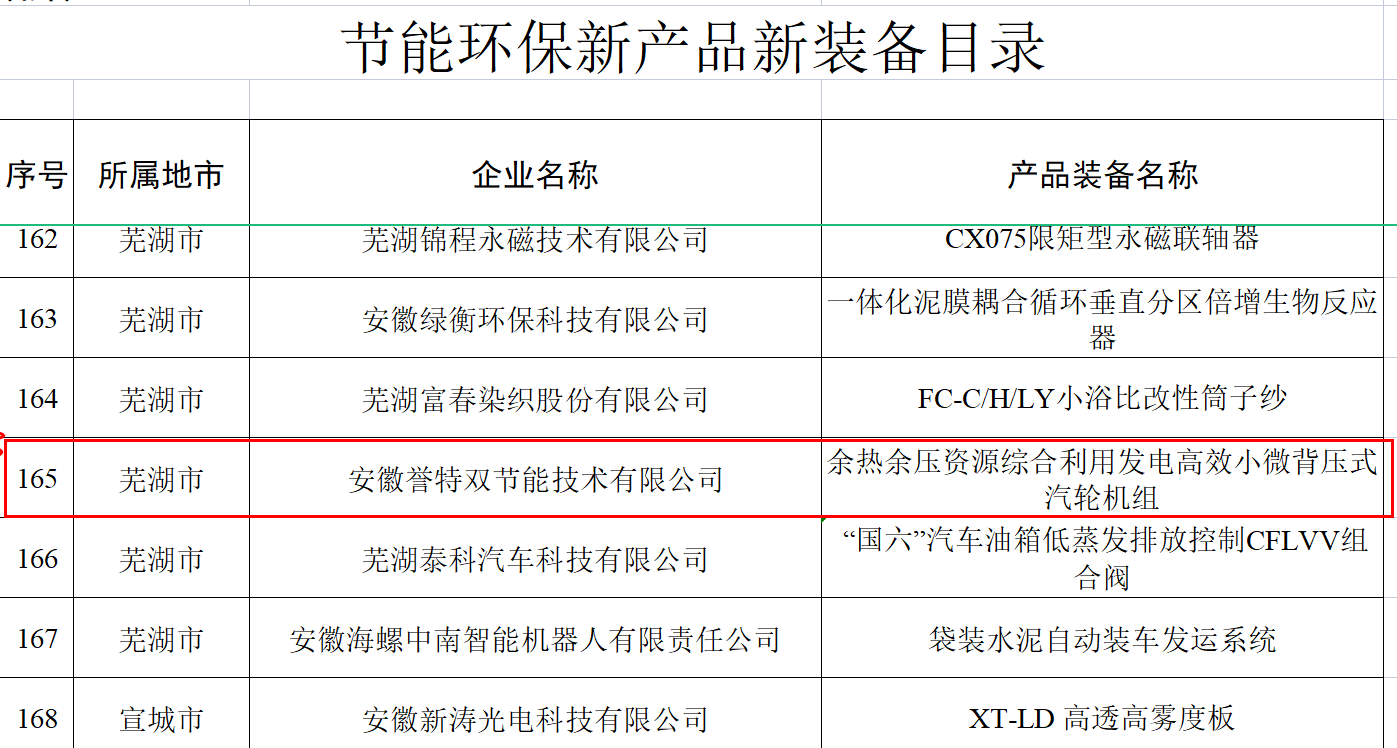 我安徽譽(yù)特雙節(jié)能技術(shù)有限公司入選省“節(jié)能環(huán)保服務(wù)機(jī)構(gòu)目錄”、核心產(chǎn)品“余熱余壓資源綜合利用發(fā)電高效小微背壓式汽輪機(jī)組”入選節(jié)能環(huán)保新產(chǎn)品新裝備目錄、核心技術(shù)“余熱余壓資源綜合利用領(lǐng)域節(jié)能汽輪發(fā)電技術(shù)”入選節(jié)能環(huán)保先進(jìn)技術(shù)目錄。其中,節(jié)能環(huán)保服務(wù)機(jī)構(gòu)目錄名單,安徽省全行業(yè)領(lǐng)域共29戶,蕪湖市僅3戶,我公司榮登榜單,此次入選,為公司連續(xù)五年入選,在此表示熱烈祝賀。