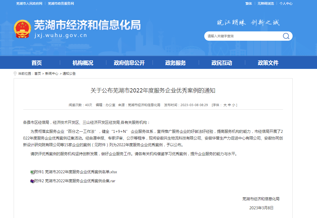 此次蕪湖市2022年度服務(wù)企業(yè)優(yōu)秀案例征集工作,由蕪湖市經(jīng)濟(jì)和信息化局遴選,旨在貫徹落實(shí)服務(wù)企業(yè)“百分之一工作法”,健全“1+9+N”企業(yè)服務(wù)體系,宣傳推廣服務(wù)企業(yè)的好做法好經(jīng)驗(yàn),提高服務(wù)機(jī)構(gòu)的能力。此次入選案例重點(diǎn)圍繞信息咨詢、技術(shù)創(chuàng)新、人才培訓(xùn)、市場(chǎng)開拓、管理咨詢、質(zhì)量管理、創(chuàng)業(yè)輔導(dǎo)、投資融資服務(wù)、信息化應(yīng)用服務(wù)等服務(wù)領(lǐng)域開展遴選工作。