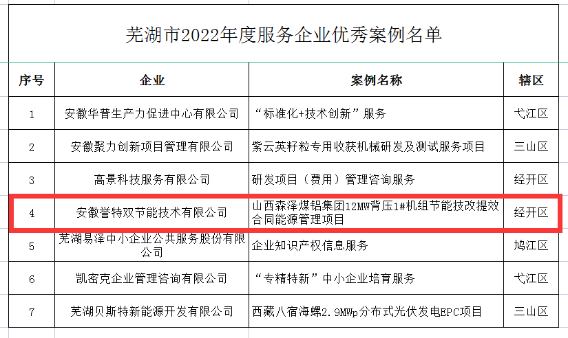 2023年3月8日我公司合作案例——山西森澤煤鋁集團(tuán)12MW 背壓1#機(jī)組節(jié)能技改提效合同能源管理項(xiàng)目,入選蕪湖市2022年度服務(wù)企業(yè)優(yōu)秀案例,本次全市共計(jì)評(píng)選出15家服務(wù)企業(yè)優(yōu)秀案例,其中經(jīng)開區(qū)4家,我公司榮列榜單。