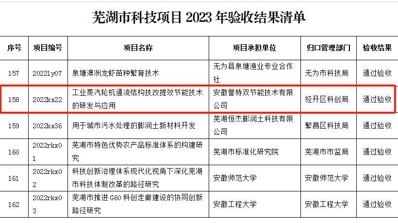 2024年2月22日,蕪湖市科學技術局發(fā)布《關于蕪湖市科技項目2023年驗收結果的通報》,我公司項目——工業(yè)蒸汽輪機通流結構技改提效節(jié)能技術的研發(fā)與應用順利通過驗收!