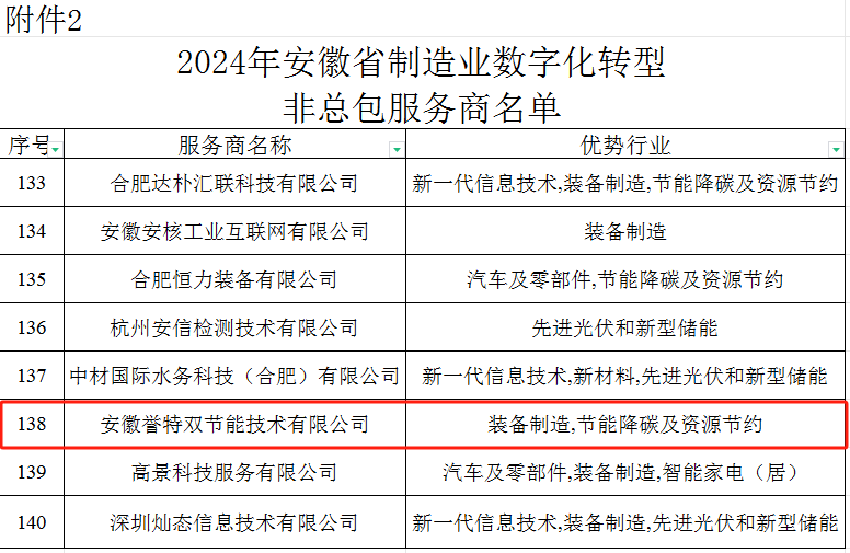 近日,根據(jù)《安徽省工業(yè)和信息化廳關(guān)于公開征集2024年度制造業(yè)數(shù)字化轉(zhuǎn)型服務(wù)商和更新完善2023年度數(shù)字化轉(zhuǎn)型服務(wù)商的通知》要求,經(jīng)各服務(wù)商提交申報材料、研究制定評審標(biāo)準(zhǔn)、專家評審等程序,由安徽省工業(yè)和信息化廳發(fā)布2024年安徽省制造業(yè)數(shù)字化轉(zhuǎn)型服務(wù)商名單,我公司名列其中,在此表示熱烈祝賀!