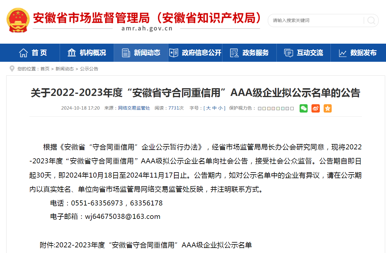 為推動(dòng)企業(yè)誠(chéng)信建設(shè)、賦能企業(yè)高質(zhì)量發(fā)展,安徽省市場(chǎng)監(jiān)督管理局經(jīng)統(tǒng)一部署,組織開展了2024年度安徽省“守合同重信用”企業(yè)評(píng)選公示活動(dòng),通過對(duì)申報(bào)的企業(yè)進(jìn)行資料復(fù)核、征信查詢、合同執(zhí)行、業(yè)績(jī)數(shù)量、市場(chǎng)口碑、企業(yè)形象、行業(yè)影響等各方面進(jìn)行評(píng)估,經(jīng)嚴(yán)格的實(shí)地核實(shí)、綜合評(píng)判,遴選出一批行業(yè)影響力大、品牌信用度高的經(jīng)營(yíng)發(fā)展態(tài)勢(shì)良好的企業(yè),我公司榮幸被評(píng)選為安徽省2022-2023年度“守合同重信用AAA級(jí)企業(yè)”,省內(nèi)平均每個(gè)地級(jí)市全行業(yè)僅在30家左右,含金量非常高,在此表示熱烈祝賀!
